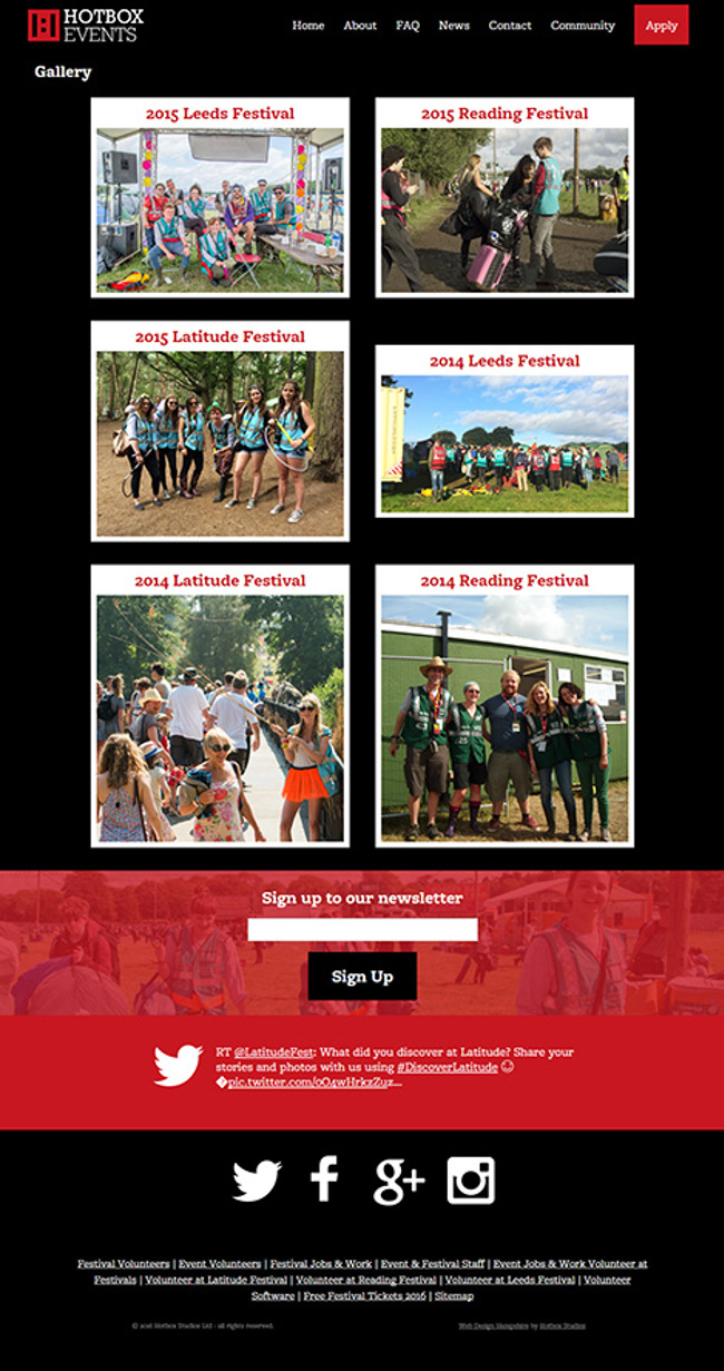 Recruiting thousands of festival staff and volunteer each year is no easy task! The Hotbox Events website is the first point of contact for new staff and volunteers, we've designed it to be as eye catching and easy to navigate as possible to encourage staff and volunteer to apply to join Hotbox Events at a festival!