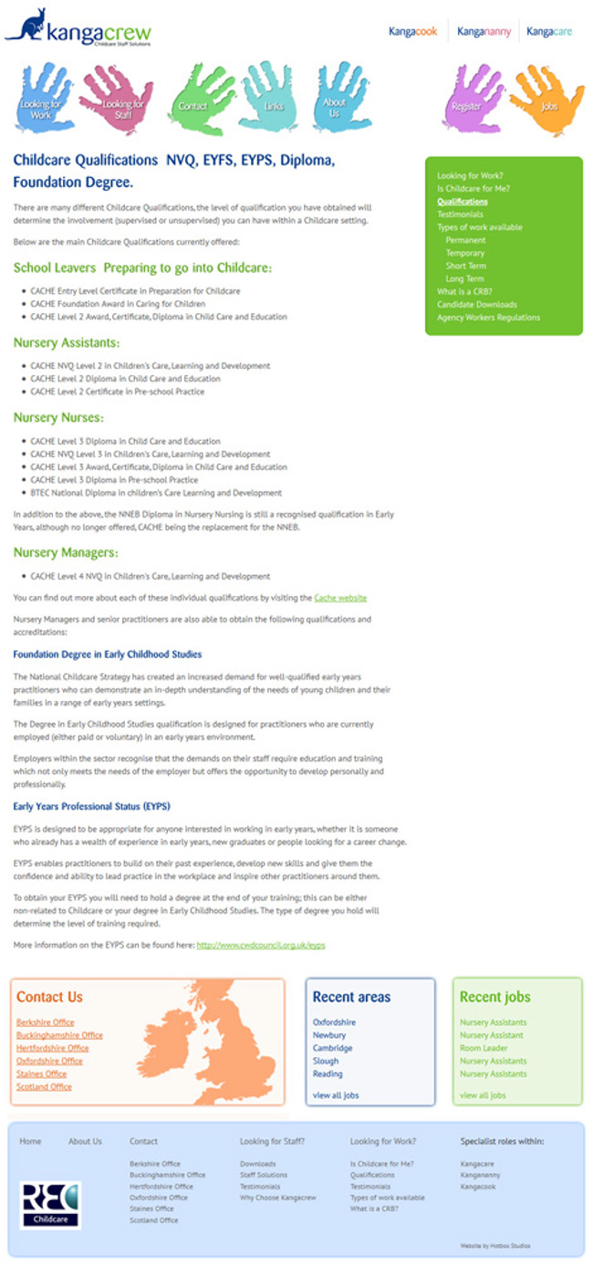 Kangacrew Childcare Staff Solutions is a recruitment agency specialising in nursery jobs and childcare staff recruitment. Working with candidates and clients Kangacrew recruits both temporary and permanent staff working as nursery staff, nursery managers, nannies, cooks and care home staff. With a wealth of recruitment and care work experience Kangacrew's dedicated consultants have a professional and transparent approach to childcare and nursery recruitment. Kangacrew has been successfully supporting the care sector since 2005.