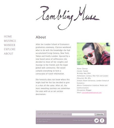 We worked closely with Clarisse in developing the Rambling Muse Blog - a collection of short stories, reviews, city guides and more. The Rambling Muse Blog is a custom design based on WordPress including tailored graphics and CSS.